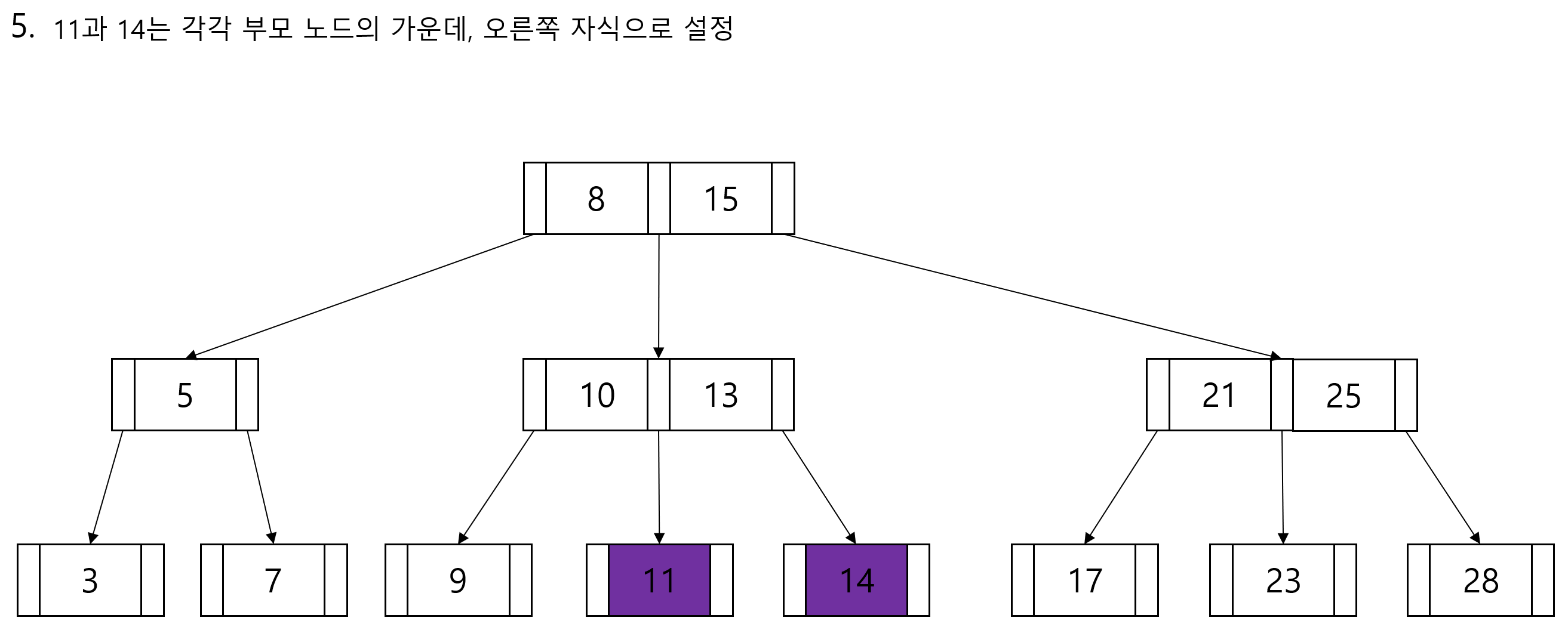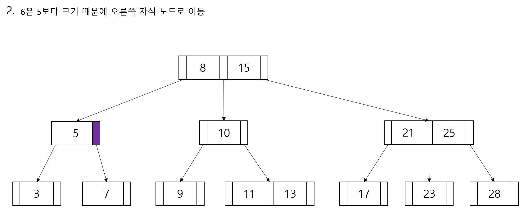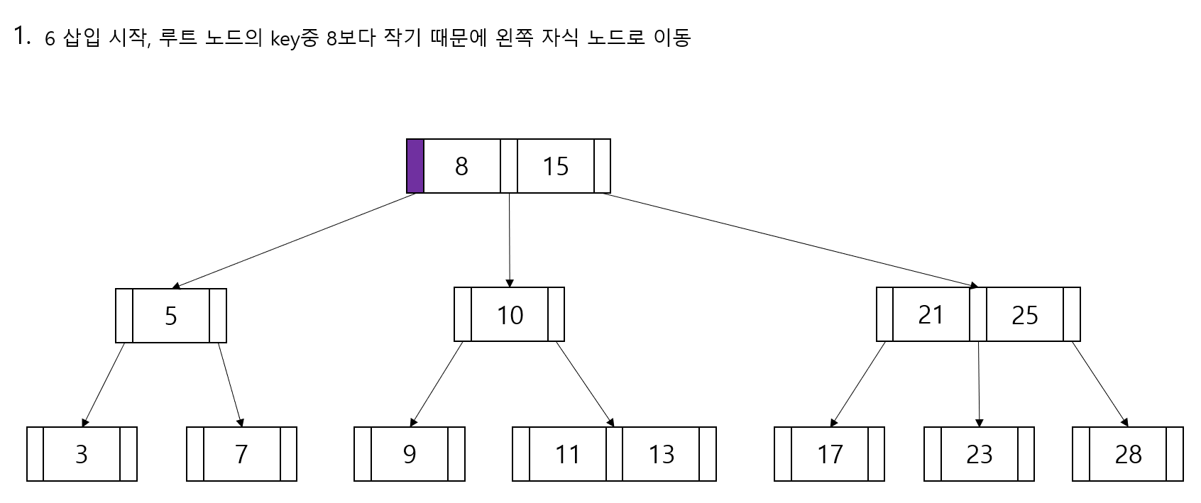 - 노드 안 데이터는 오름차순으로 정렬됩니다.