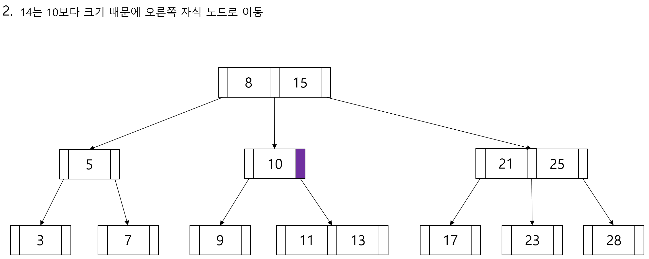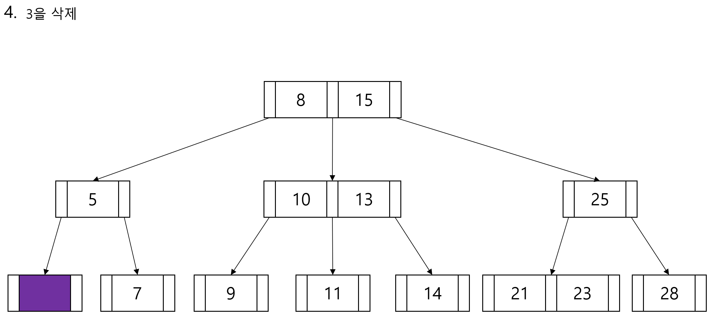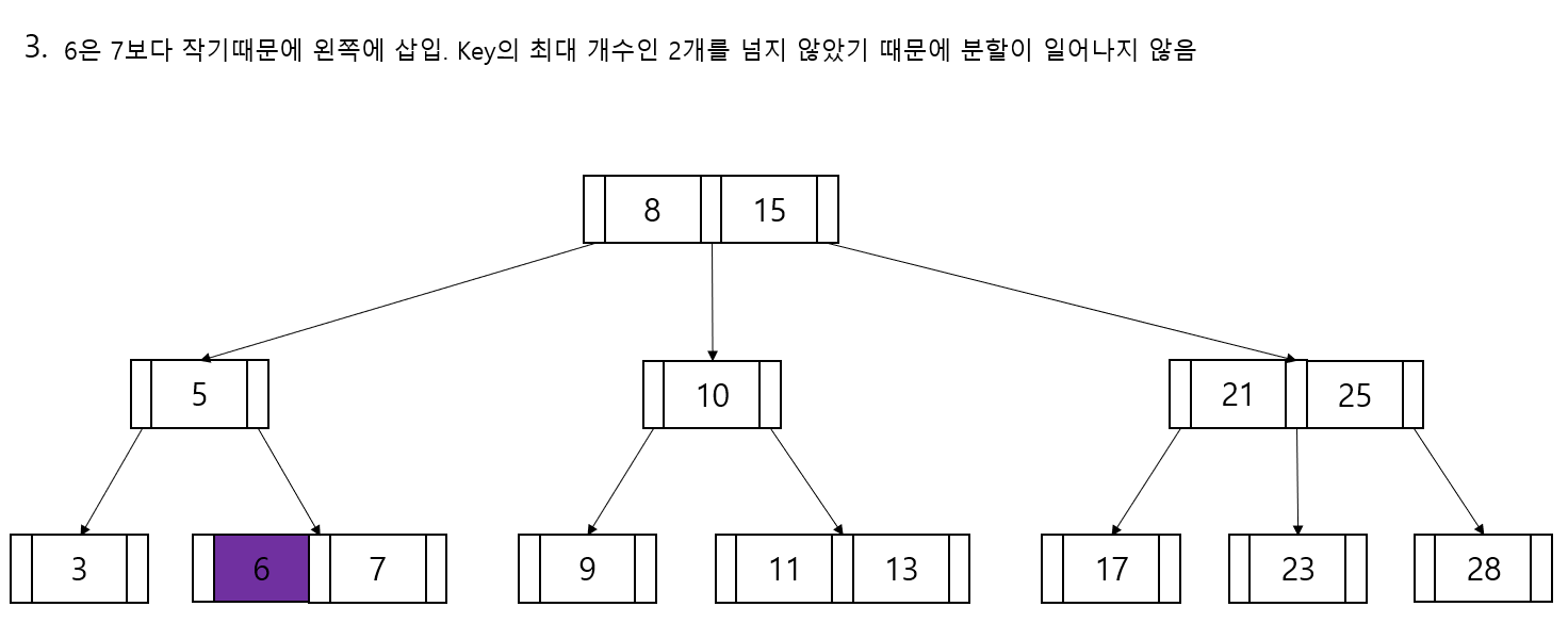 3차 B-tree라면 최대 3개의 자식 노드를 가질 수 있습니다.