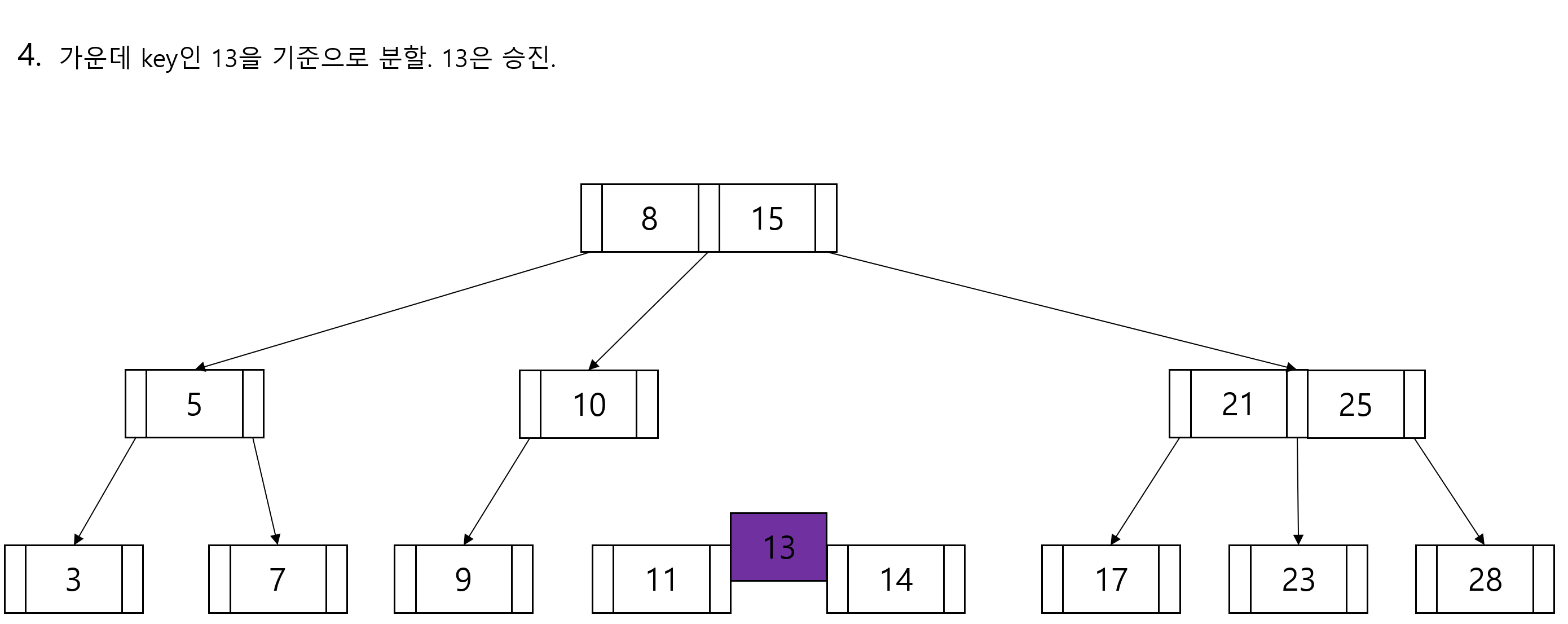 데이터를 삽입하는 과정에서 노드가 가질 수 있는 최대 key의 개수인 M-1개를 넘게 된다면 가운데 key를 기준으로 좌우 key들을 분할하고 가운데 key는 승진합니다.
