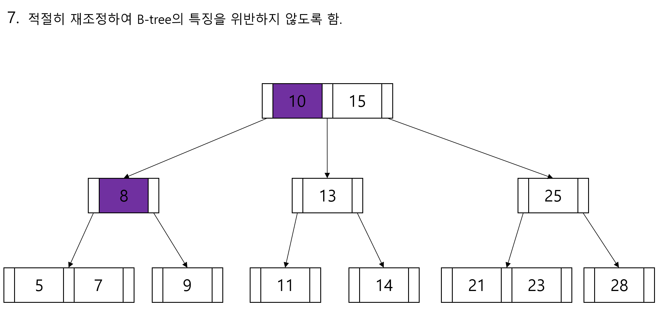 데이터 삭제 시에도 B-tree의 특징에 맞춰서 재조정이 일어납니다.
