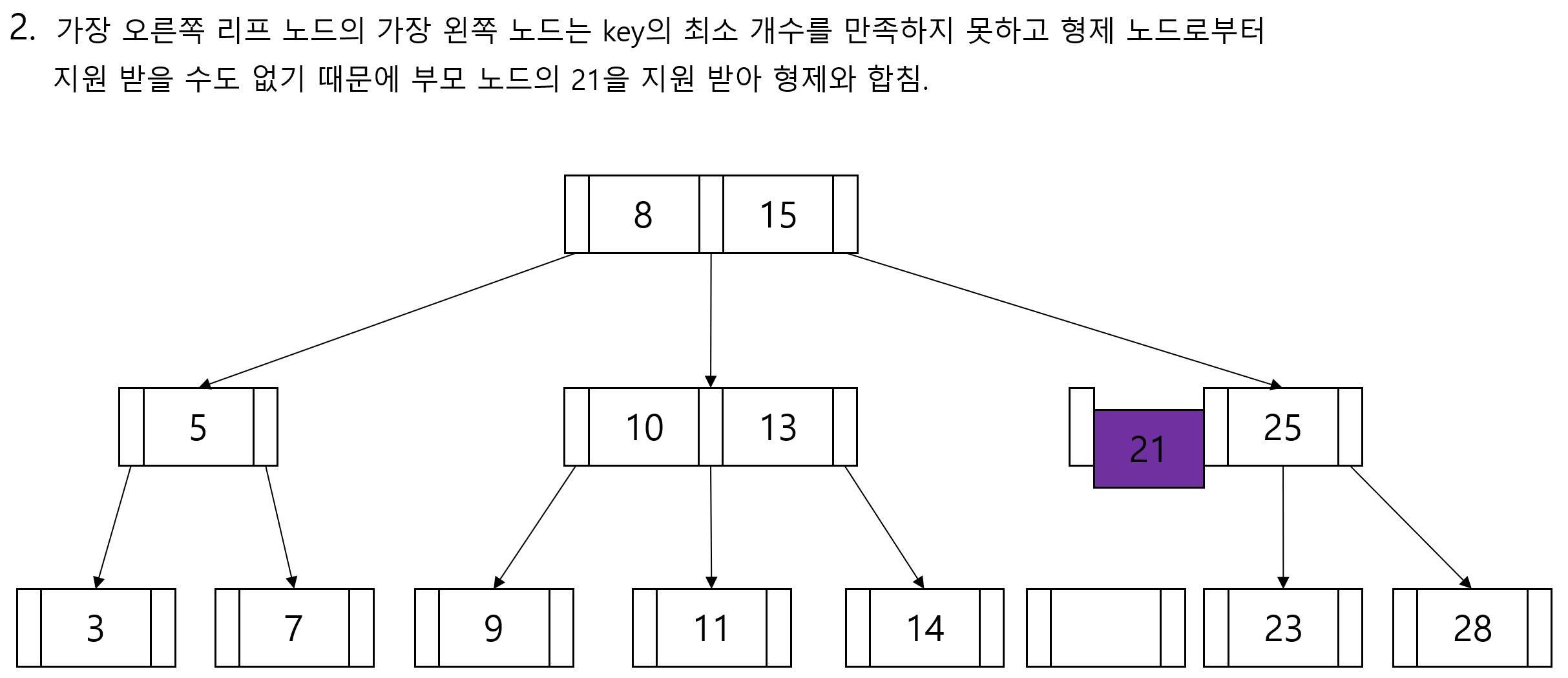 형과 나 사이의 key를 부모 노드로부터 받고 그 key와 형의 key를 차례로 나에게 합친 뒤 형의 노드를 삭제합니다.