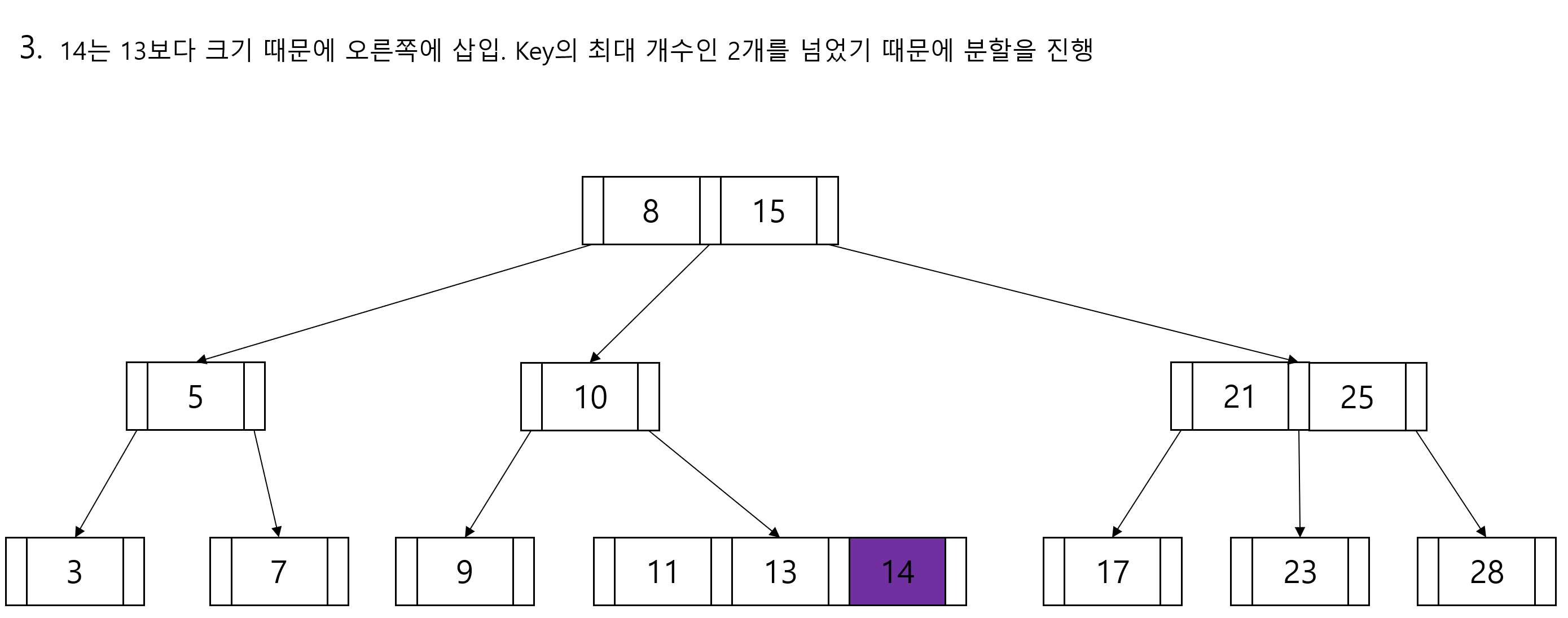 데이터를 삽입하는 과정에서 노드가 가질 수 있는 최대 key의 개수인 M-1개를 넘게 된다면 가운데 key를 기준으로 좌우 key들을 분할하고 가운데 key는 승진합니다.