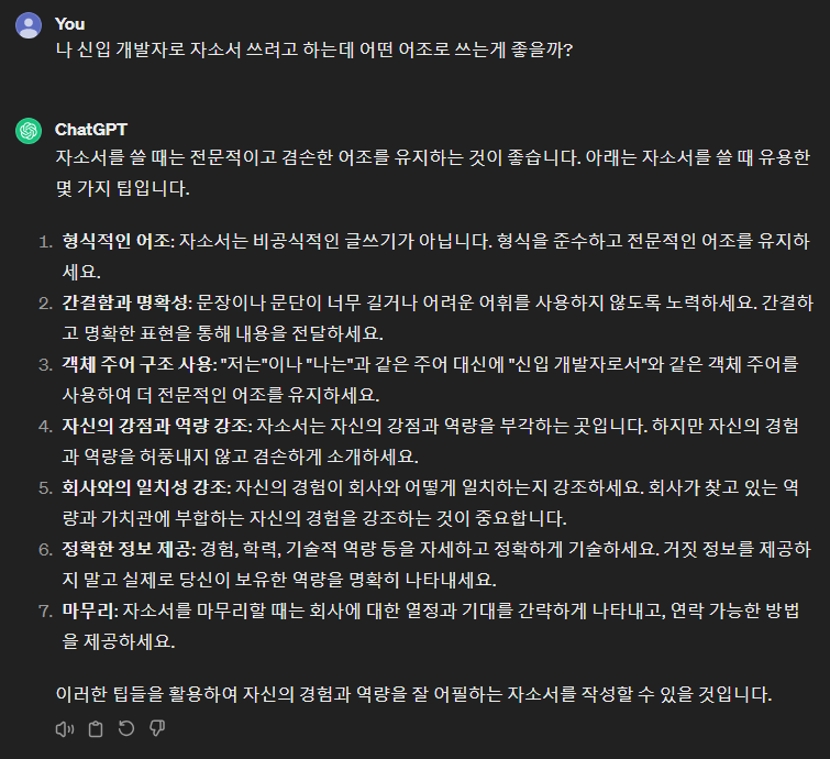 이렇게 Chat GPT에게 질문한 뒤 "자소서를 형식적인 어조로 고쳐주고 객체 주어 구조를 사용해줘"와 같이 요구하면 됩니다.