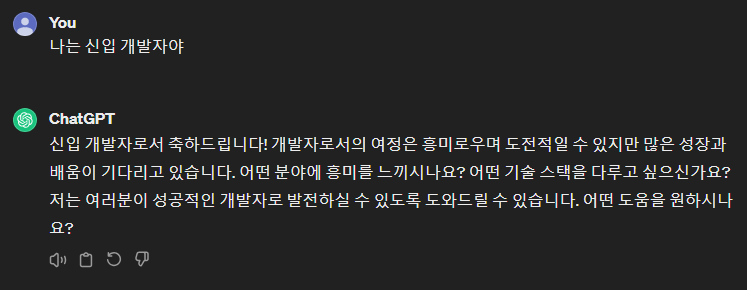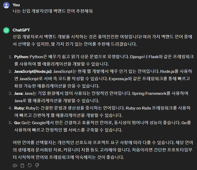 단순히 "나는 신입 개발자인데 백엔드 언어 추천해 줘"와 같은 질문으로도 원하는 답변을 얻을 수 있지만, "나는 Java를 공부한 신입 개발자인데 다른 언어도 공부해 보고 싶어. 공부할 수 있는 시간이 많지 않은데 공부할만한 백엔드 언어 추천해 줘"와 같이 질문한다면 보다 구체적인 답변을 생성할 수 있습니다.